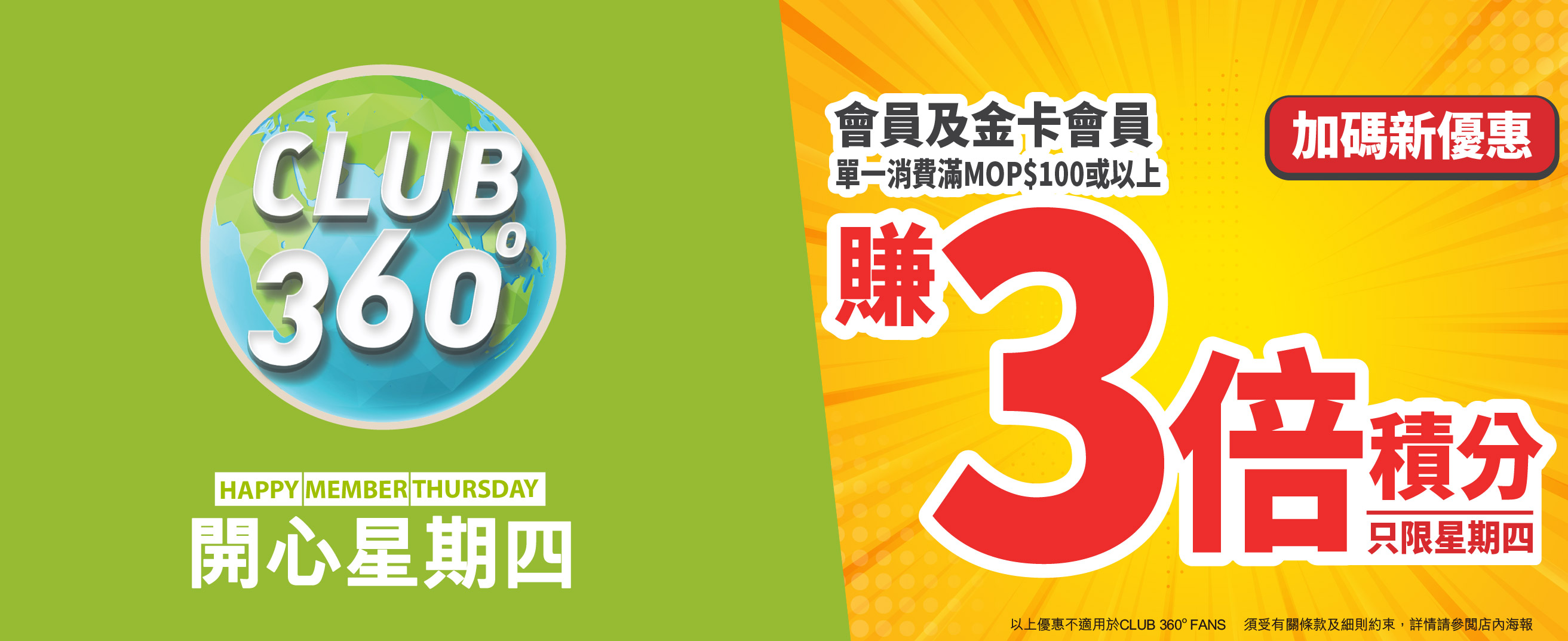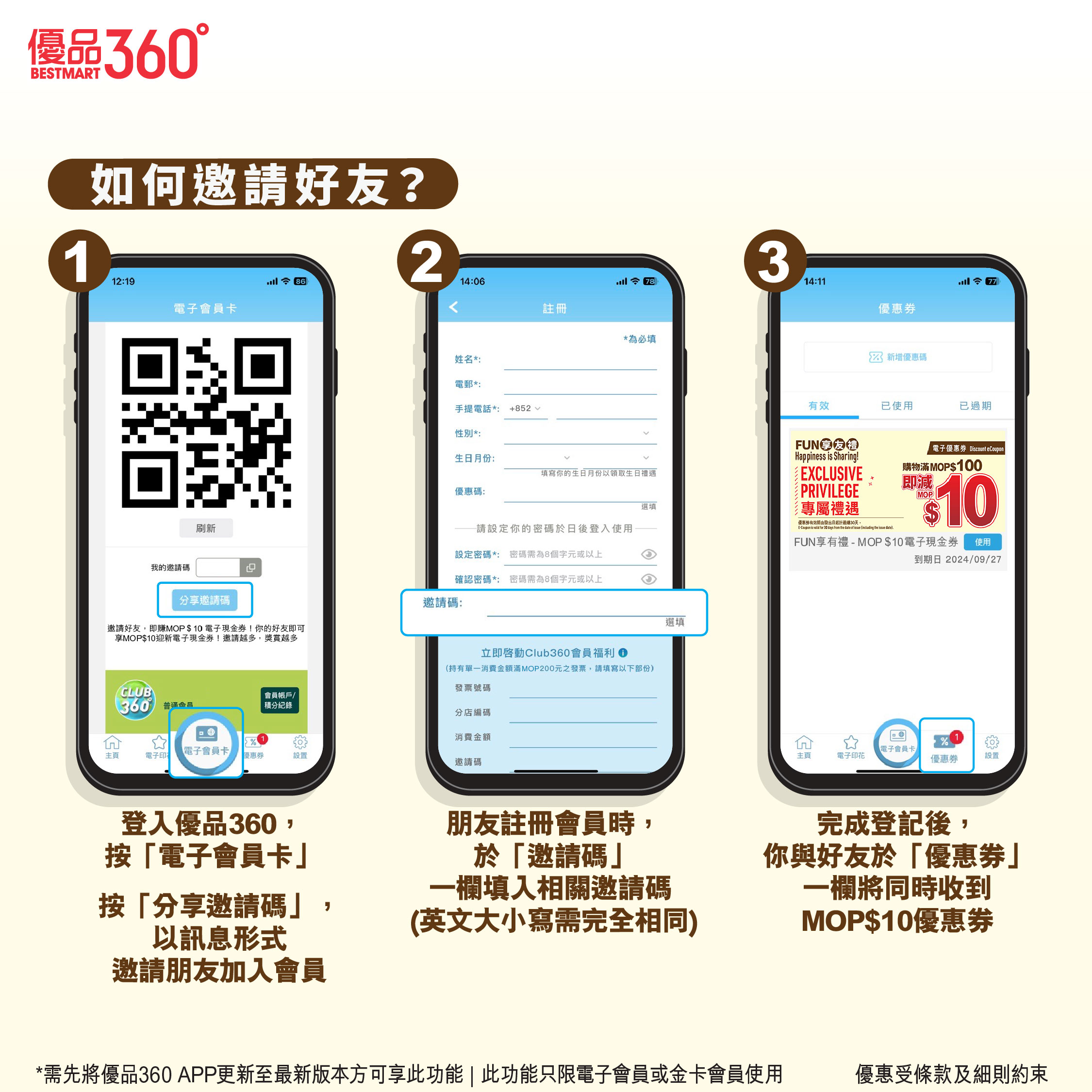 推薦人必須為現有CLUB 360°電子會員或金卡會員。推薦人必須轉發由本公司所發放的好友推薦碼以推薦任何人士(「受薦人」),受薦人必須下載「優品360」手機應用程式及於登記頁面中輸入好友推薦碼,並登記成「優品360」手機應用程式會員,方合資格享有電子現金券。 推薦人可於同時段內邀請多位好友參與,一位推薦人可最多成功邀請50人成為「優品360」手機應用程式會員。受薦人成功獲邀並領取電子現金券後不可再次獲邀。電子現金券將於成功註冊後自動存入至該會員戶口。電子現金券適用於澳門地區優品360店舖購物滿MOP$100或以上,即可使用一張(單一發票及折實價計算)。有效期由發出日起計連續30天。貨品如需退款,將從退款中扣除已支付的電子現金券價值。每張電子現金券只限使用一次,每次限用一張,一經使用,即告失效及不會補發。電子現金券不能與其他優惠同時使用。會員須透過「優品360」手機應用程式登入會員帳號及出示電子現金券,恕不接受影印本及截圖。請於付款前出示電子現金券。電子現金券只限指定會員使用,轉發無效。電子現金券不可作轉售、兌換現金,不可與其他優惠同時使用及不設找贖。推薦碼一經被使用,即表示推薦人或/及受薦人均已接受本推廣活動之條款及細則並受其約束。如推薦人及受薦人獲享推薦獎賞涉及任何舞弊及/或欺詐成分,本公司有權取消推薦人及受薦人享有之推薦獎賞而不作另行通知。推薦紀錄以本公司的紀錄為準,不得異議。會員須遵守CLUB 360°會員條款及細則,詳情請瀏覽網頁https://www.bestmart360.com/terms。如有任何爭議,優品360澳門限公司保留最終解釋權及決定權。