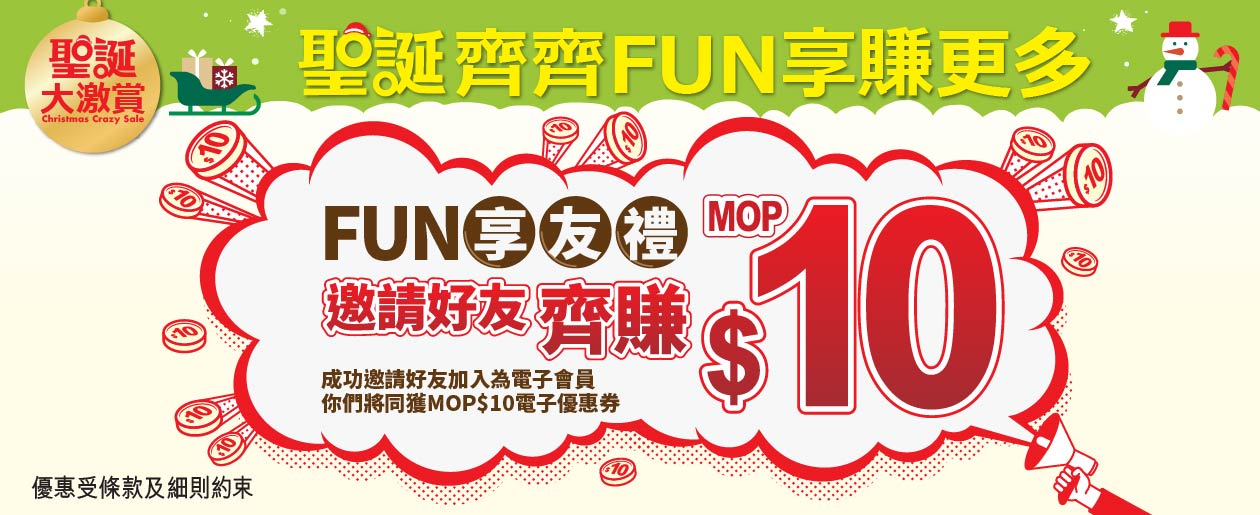 CLUB 360° 電子會員/金卡會員嘅你,成功推薦好友用你專屬嘅邀請碼,下載優品360 App並登記加入CLUB 360°,你同好友將獲得MOP$10電子優惠券。
