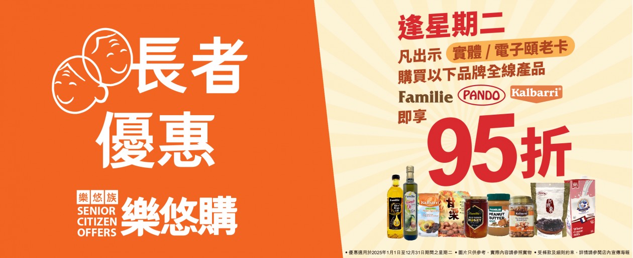 【逢星期二長者優惠日】公公婆婆只要出示頤老卡,購買任何Familie,Pando或Kalbarri產品即享95折