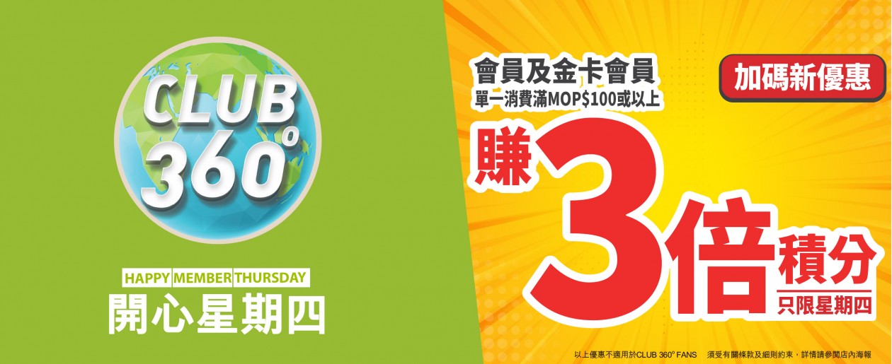 會員每週一雙倍積分 | 金卡會員每月1/11/21號滿MOP$120即享95折優惠